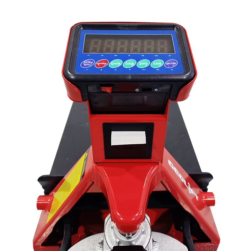 The 2.5T GEOLIFT AC25WSP Weight Scale Printer Pallet Truck is built for efficient logistics, featuring an integrated weighing system with an onboard printer. Ideal for shipping, receiving, and inventory, it enables instant documentation of load weights during handling.